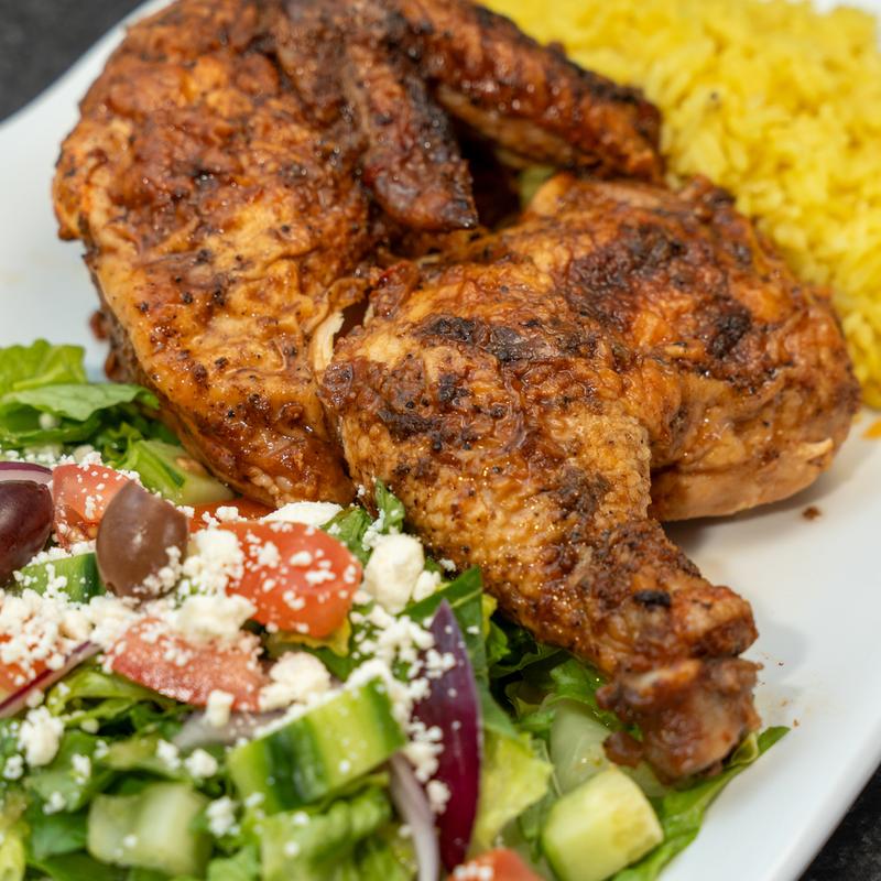Roasted and broiled, seasoned and marinated half a chicken. Served with yellow rice, greek salad and pita bread