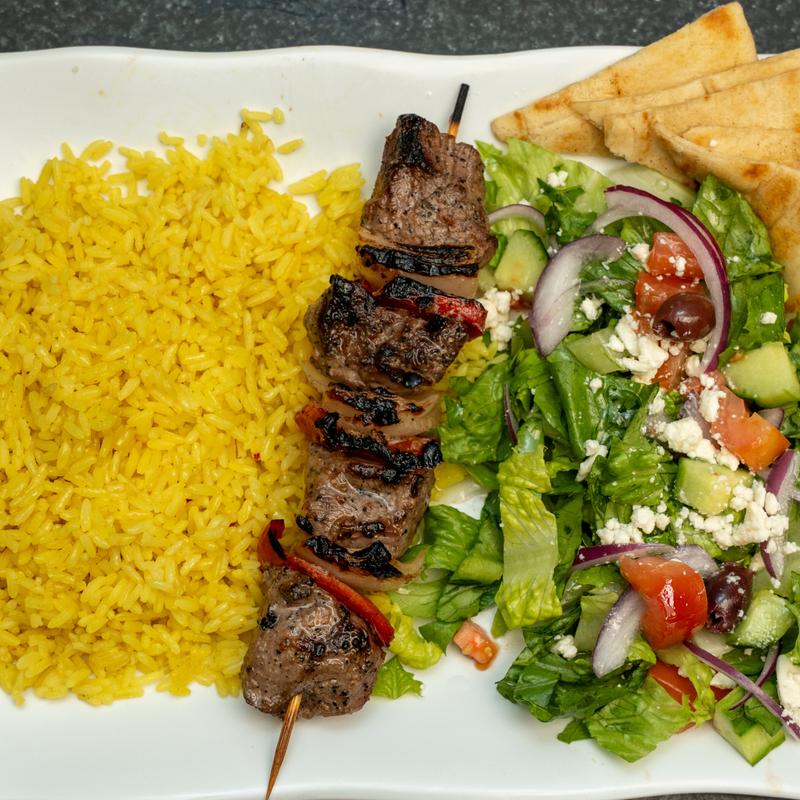 1 skewer of juicy marinated boneless chicken served with the basmati rice and the choice of hummus or Greek salad