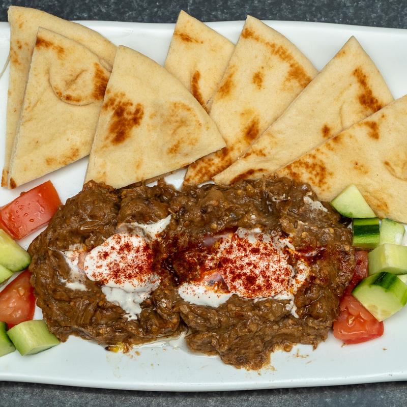A medley of eggplant, sauted fresh garlic & onion, with a topping of homemade yogurt served with warm pita bread